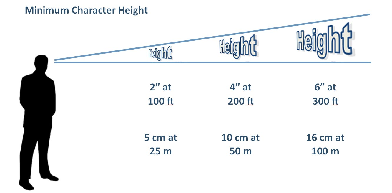 Il fattore più importante della segnaletica a LED è la distanza di visualizzazione. Se il tuo cartello verrà visualizzato da lunghe distanze da persone in macchina che guidano velocemente, avrai bisogno di caratteri di grandi dimensioni per renderlo leggibile. Come regola della tomba hai bisogno di almeno 2 pollici di altezza del carattere per ogni 100 piedi di distanza di visualizzazione per renderlo leggibile. Per la segnaletica a colori con supporto per immagini e video, potresti aver bisogno di dimensioni maggiori per avere un impatto migliore sul visualizzatore.