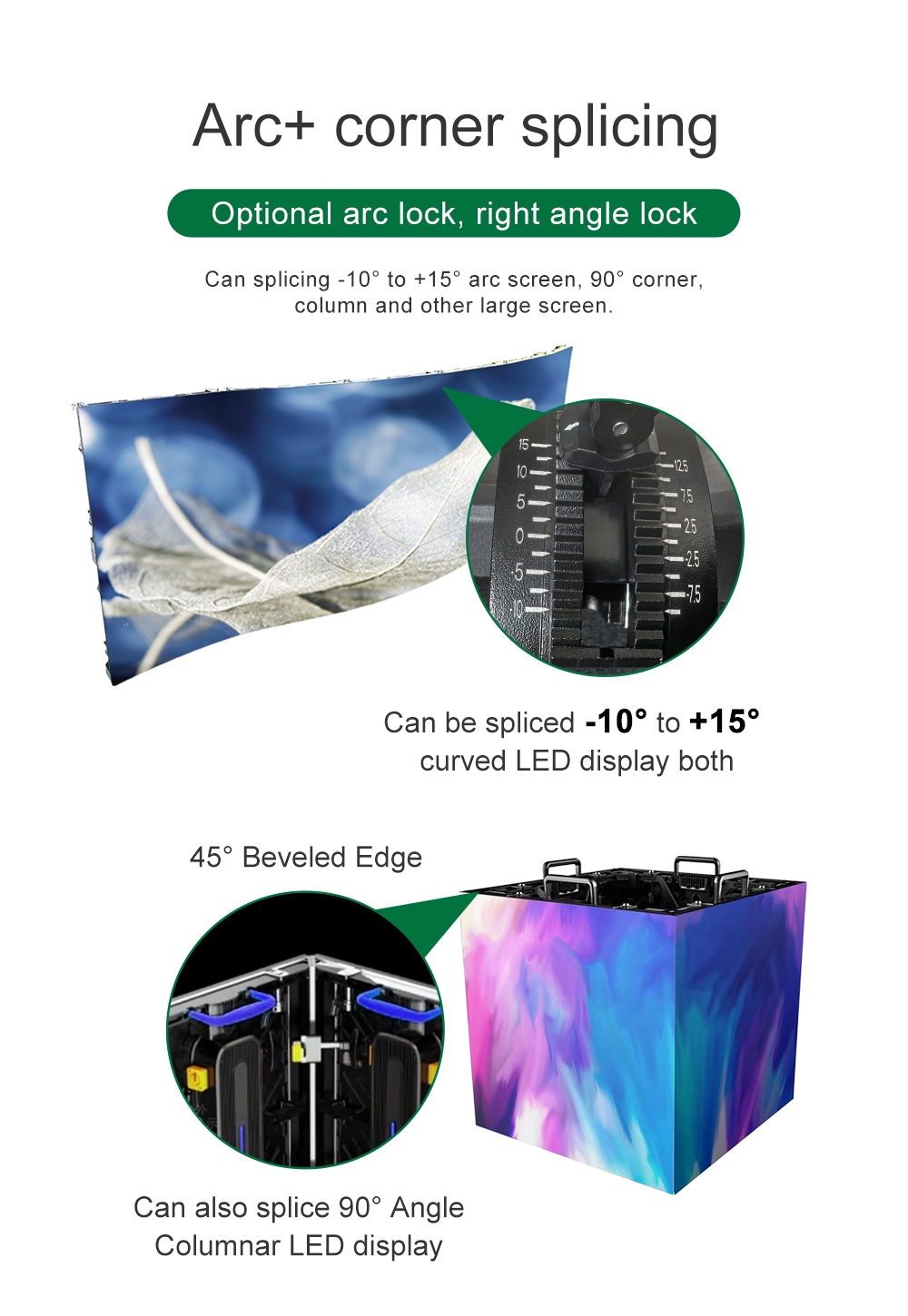 * Adattabile a molteplici scenari: compatibile con cabinet da 500*500 mm e 1000 mm, consentendo installazioni miste. La versione curva supporta configurazioni per schermi con angolazione da -10° a 15°, angoli a 90° e installazioni a colonna per display di grandi dimensioni.