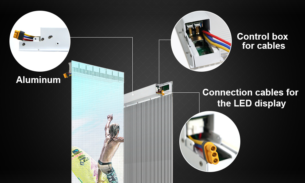 Gli schermi sono giuntati tramite piastra trasparente e le scatole di alimentazione sono giuntate tramite profili