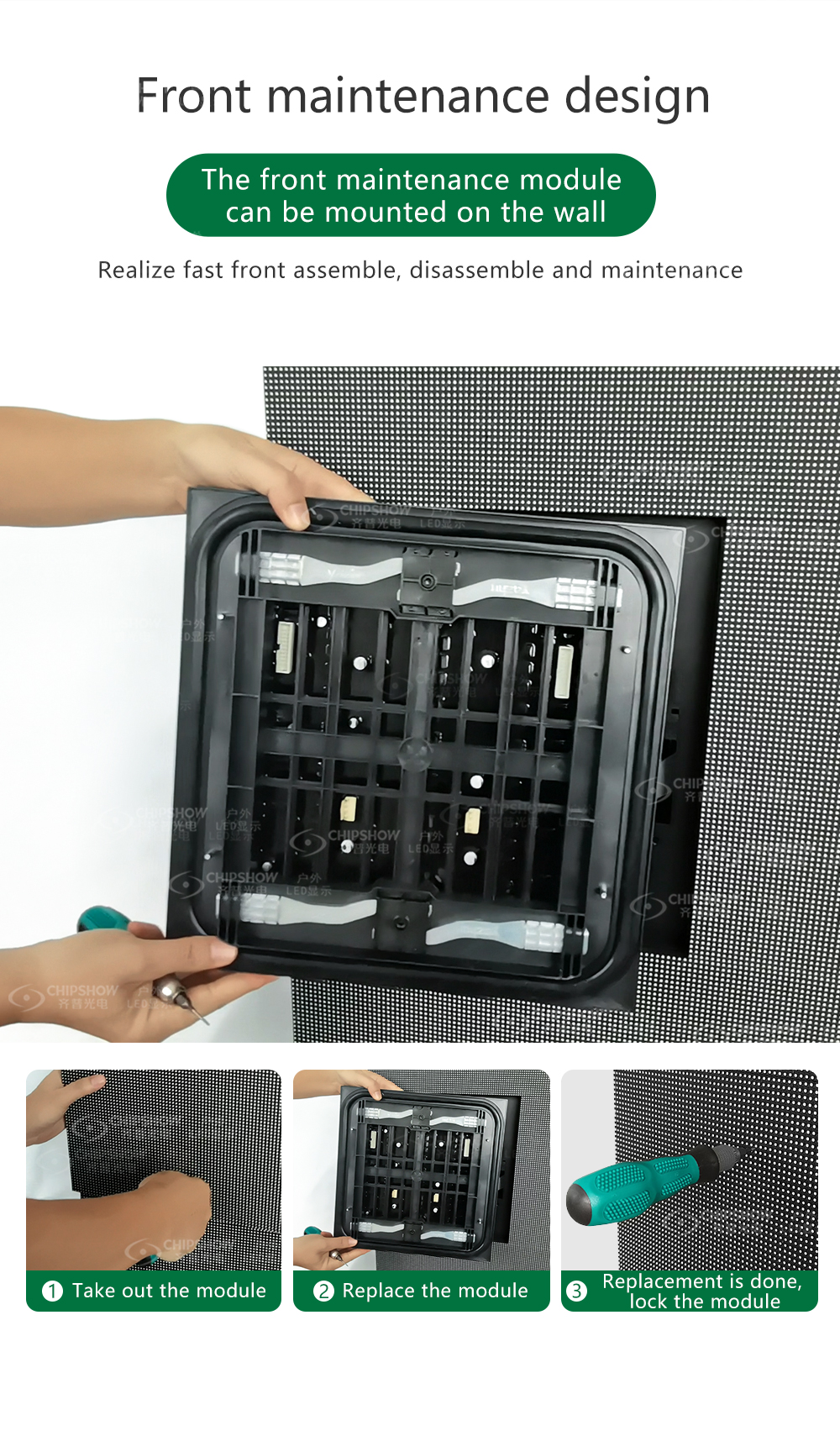 4 Design sul servizio frontale: i moduli LED supportano il servizio anteriore; Pertanto, quando si tratta di installazione montata a parete, puoi facilmente assemblare e smontare i moduli;