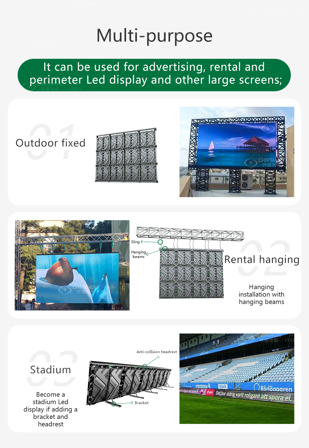 3 scopi multipli: la schermata di cartellone C-FIT può essere usato Come soluzione di visualizzazione fissa economica, una soluzione di visualizzazione a noleggio che supporta l'installazione di sospensione e una soluzione di visualizzazione per recinzioni perimetrali dello stadio;