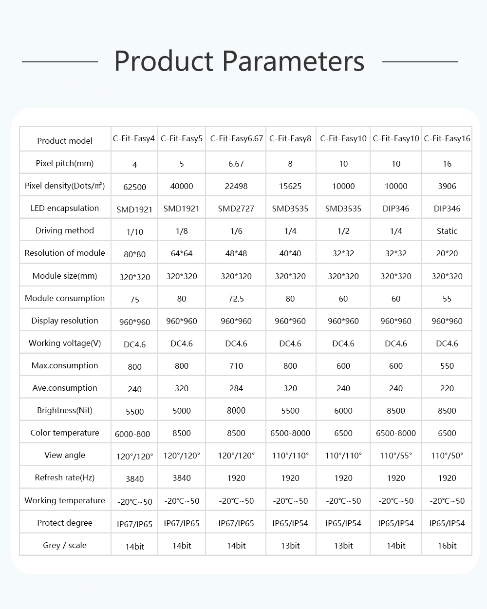 7 elevato grado di protezione: il grado di protezione della serie C-Fit-Easy raggiunge IP65; E questo tipo di schermo di cartelloni pubblicitari è molto adatto per pubblicità esterne di grande formato, come LED esterno muri, e schermate a LED con un sistema di stack a terra;