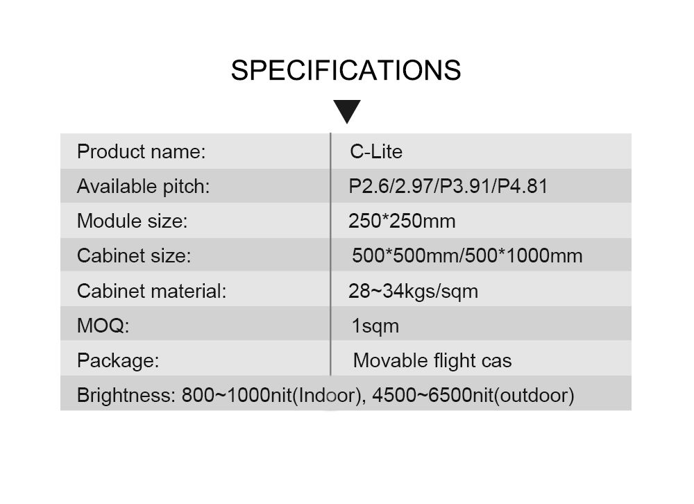 La serie C-lite è una tipologia di schermo LED a noleggio altamente conveniente, ideale per diverse attività; i cabinet in alluminio pressofuso con chiusure rapide e comodi connettori per cavi facilitano l'installazione e lo smontaggio in modo rapido e semplice. È inoltre possibile aggiungere chiusure a scala per realizzare uno schermo LED curvo.