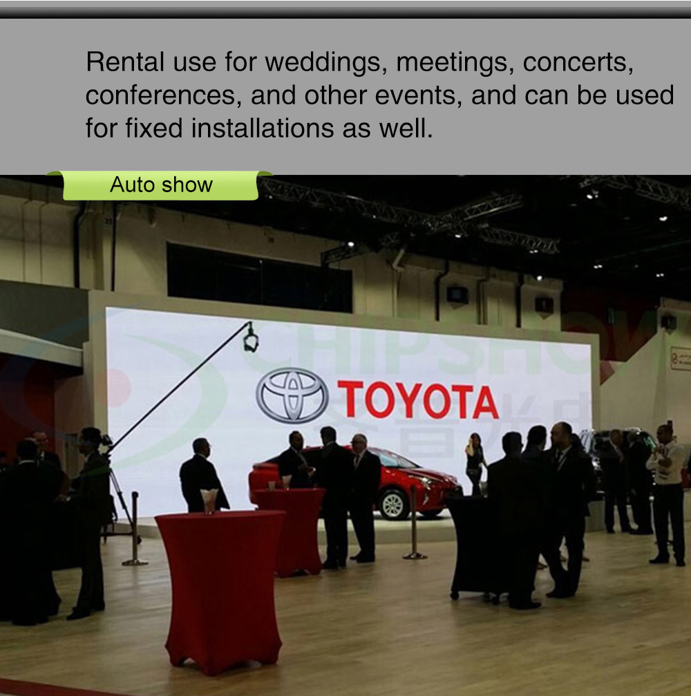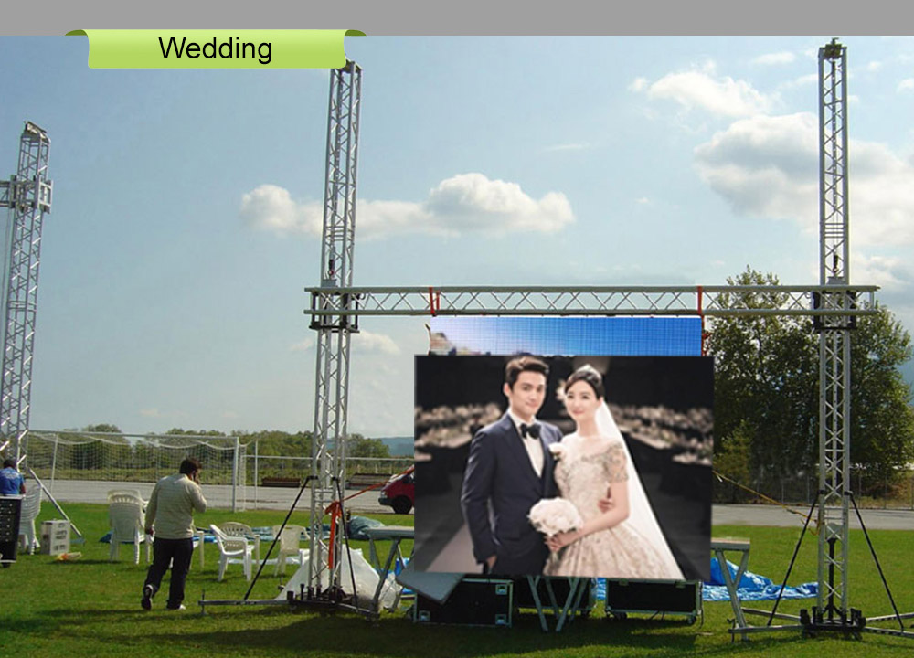 Schermi a noleggio per matrimoni, conferenze, concerti, eventi di lancio e ogni genere di attività; possono essere utilizzati anche come soluzioni di visualizzazione mobili e permanenti, come schermi a LED per rimorchi mobili e schermi perimetrali per stadi.