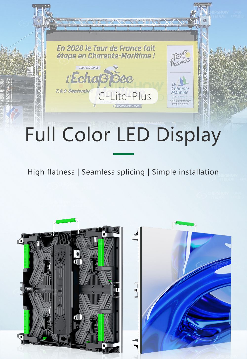 Caratteristiche: 1 Praticità: i moduli adottano un design semplice e pratico, caratterizzato da comode chiusure rapide e maniglie solide; 2. Assistenza anteriore e posteriore: gli schermi LED possono essere montati, smontati e sottoposti a manutenzione rapidamente sia dalla parte anteriore che posteriore; 3 Resistente e durevole: ogni maniglia è integrata con rinforzi orizzontali e trasversali per evitare deformazioni durante l'installazione fissa e l'installazione sospesa per l'uso a noleggio; 4 Design magnetico (opzionale): puoi scegliere di utilizzare i magneti superiori e inferiori tra i mobili per posizionare e installare rapidamente; dal punto di vista dell'installazione per i servizi di noleggio, questo tipo di schermo LED è molto conveniente; 5. Molto venduto: finora sono stati venduti in tutto il mondo più di 5000 schermi LED della serie C-Lite-Plus; garantiamo scorte sufficienti e una consegna rapida; 6 Ampia applicazione: la serie C-Lite-Plus è molto adatta come schermi LED a noleggio per palchi teatrali, spettacoli espositivi, lanci di prodotti, piazze commerciali, grandi eventi sportivi, ecc.;