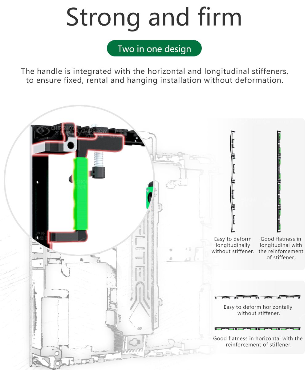 1 Eccellente planarità, elevata resistenza alla deformazione: la serie C-Shine-Plus (GOB) adotta armadietti in lega di alluminio ad alta resistenza (grado ADC-12) pressofusi con buona planarità e buona resistenza alla deformazione; anche se lo schermo viene frequentemente montato e smontato, gli armadietti possono comunque rimanere piatti;2 Design pratico: seguendo il principio di essere pratici e semplici, gli armadietti adottano un design minimalista, come comode serrature rapide e maniglie ampie e robuste;3 Moduli magnetici: supportano la manutenzione anteriore e posteriore dei moduli; grazie alla posizione magnetica tra gli armadietti, lo schermo del display può essere assemblato in modo rapido e preciso.4 Elevate prestazioni di protezione: oltre alla tecnologia di incapsulamento GOB utilizzata dai moduli, gli armadi sono dotati di sporgenze anticollisione e angoli protettivi; quindi la superficie dello schermo è altamente protettiva, il che evita notevolmente danni durante l'installazione e il trasporto;5 La serie C-Shine-Plus (GOB) supporta l'installazione sospesa e l'installazione a terra; come soluzione di visualizzazione economica e altamente efficiente per tutti i tipi di occasioni di installazione a noleggio, è apprezzata dai clienti in un'ampia gamma di settori (ad esempio energia, militari, sicurezza pubblica, IT, finanza e giustizia) che necessitano di soluzioni di visualizzazione digitale intelligenti;