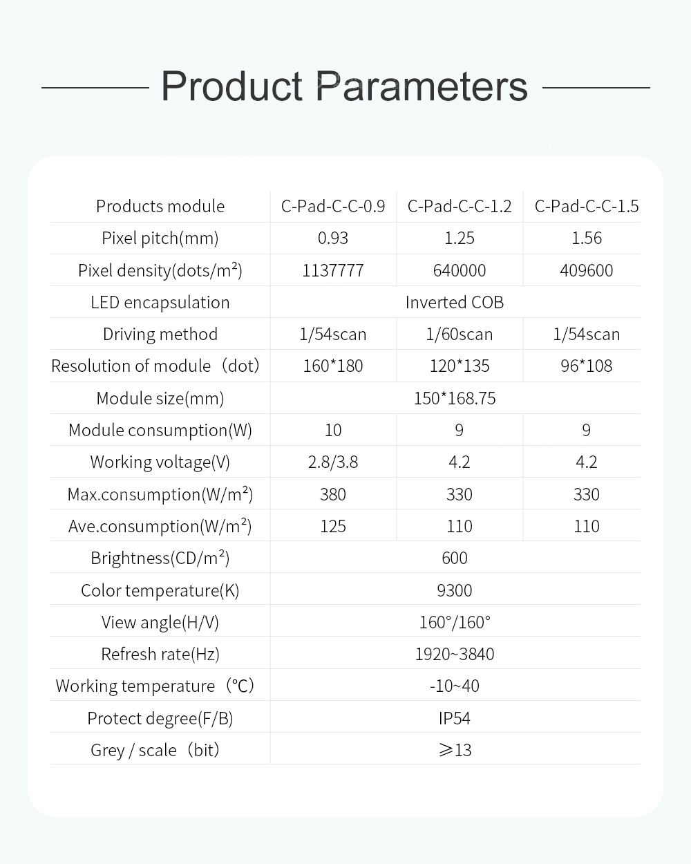 1, alta affidabilità: adatto per moduli COB p0.9 p1.2 p1.5, superficie resistente all'umidità, anticollisione, antistatica, a prova di impronte digitali, la superficie del LED può essere strofinata senza problemi con un panno.