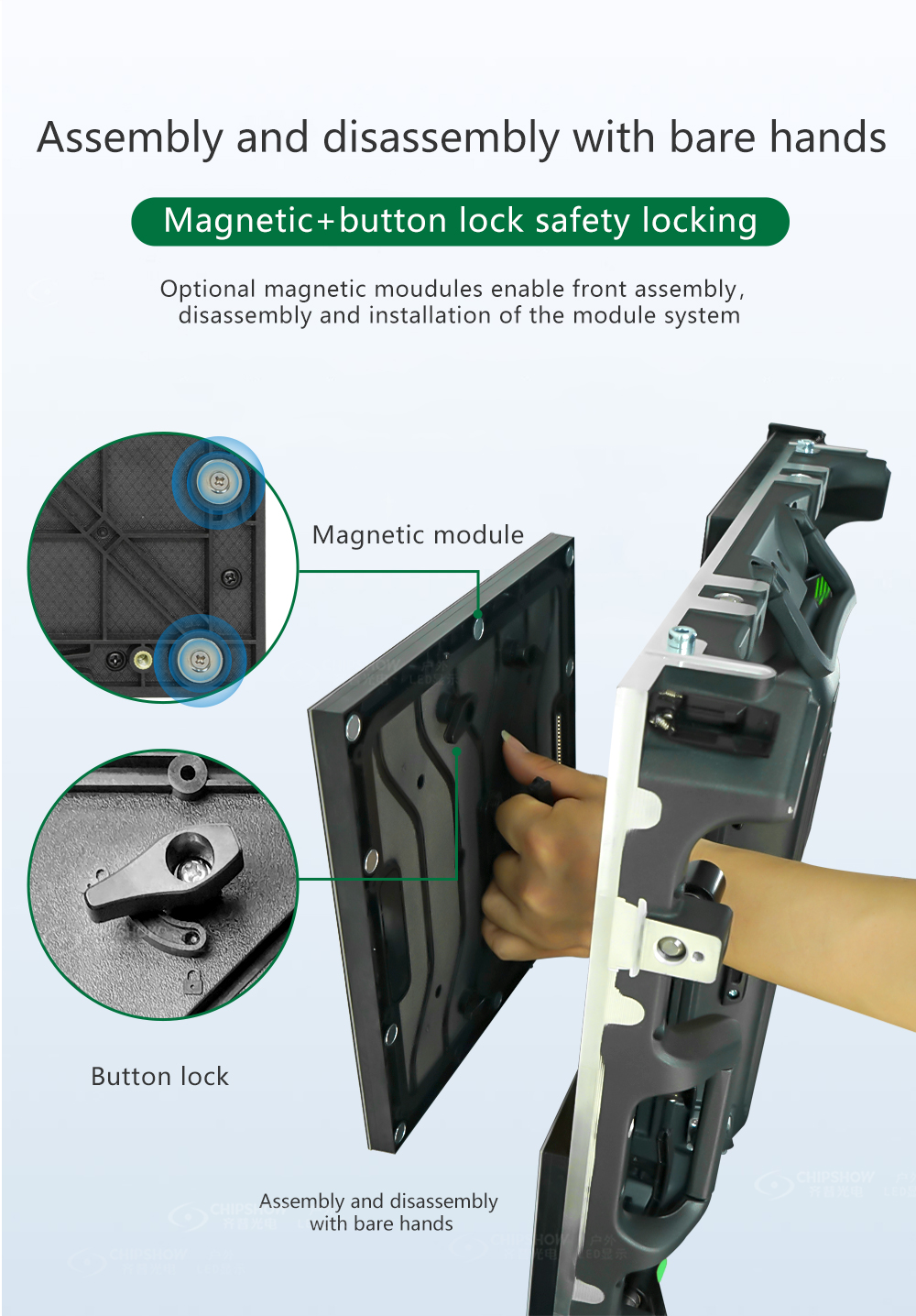 6. Il modulo magnetico opzionale può realizzare l'assemblaggio, lo smontaggio e la manutenzione completi del modulo e dell'alimentazione nella parte anteriore.