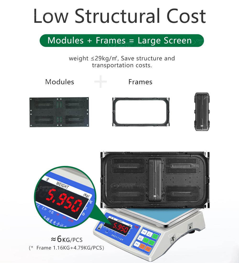 1 Basso costo strutturale: basta una semplice staffa per formare un grande schermo LED; il peso del modulo è inferiore a 29 kg/ã¡; questo può aiutarti a risparmiare sui costi di trasporto e sulle strutture portanti;