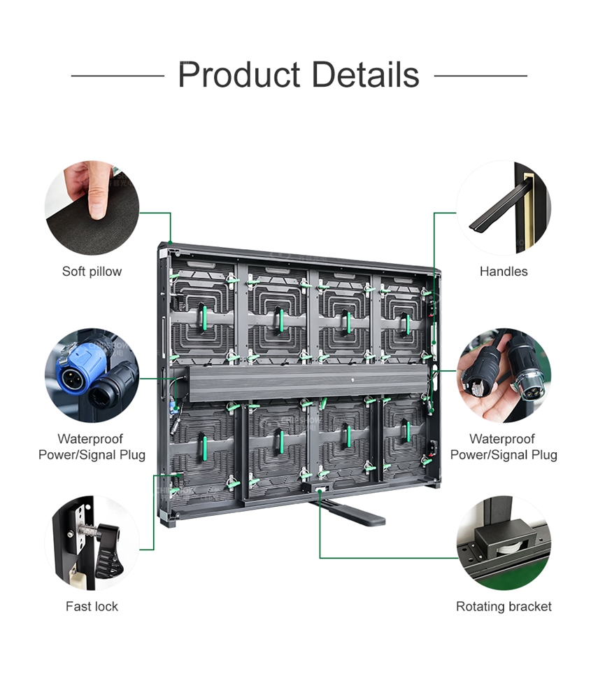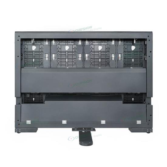 ◙ L'armadio è dotato di una staffa girevole di 90° e di chiusure rapide sinistra e destra per un montaggio efficiente del display LED dello stadio.