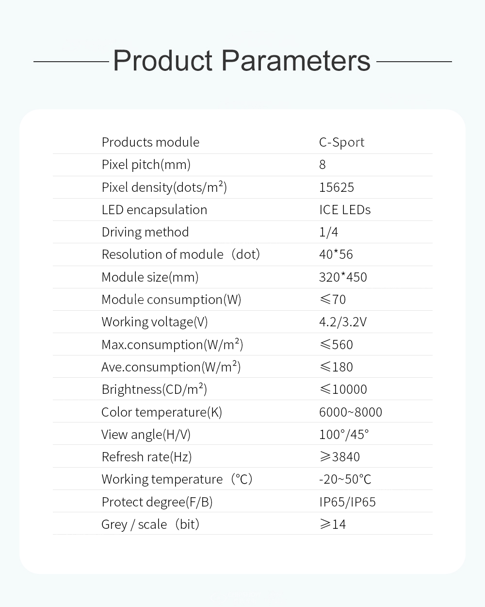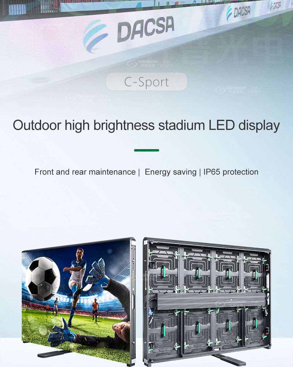6 Rispetto agli schermi LED convenzionali, la serie Chipshow C-Sport è a risparmio energetico: è possibile risparmiare circa 1/3 del consumo energetico; questo riduce notevolmente i costi operativi;