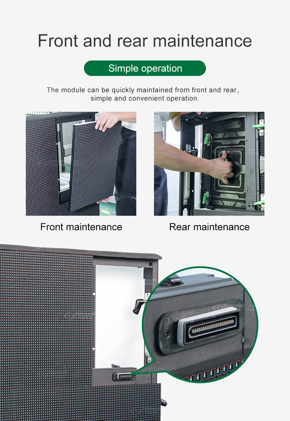 4 Ogni modulo LED supporta il servizio anteriore e posteriore, ciò semplifica l'operazione durante l'installazione e la successiva manutenzione;
