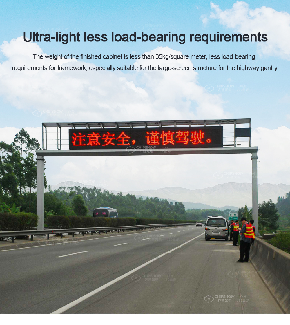 6 Ultraleggero: il peso di ogni armadio finito è inferiore a 35 kg/㎡, quindi non ha requisiti rigorosi sulla resistenza della struttura portante ed è abbastanza adatto come grandi schermi a LED sulle autostrade;