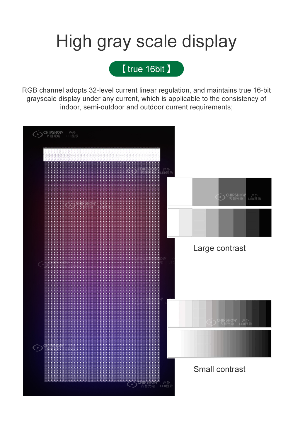 3 Scala di grigi elevata: il canale RGB adotta la regolazione lineare (livello di corrente a 32 livelli) per visualizzare l'immagine in scala di grigi a 16 bit con qualsiasi corrente; quindi non devi preoccuparti del fabbisogno di corrente in ingresso sia in circostanze interne che semi-esterne;