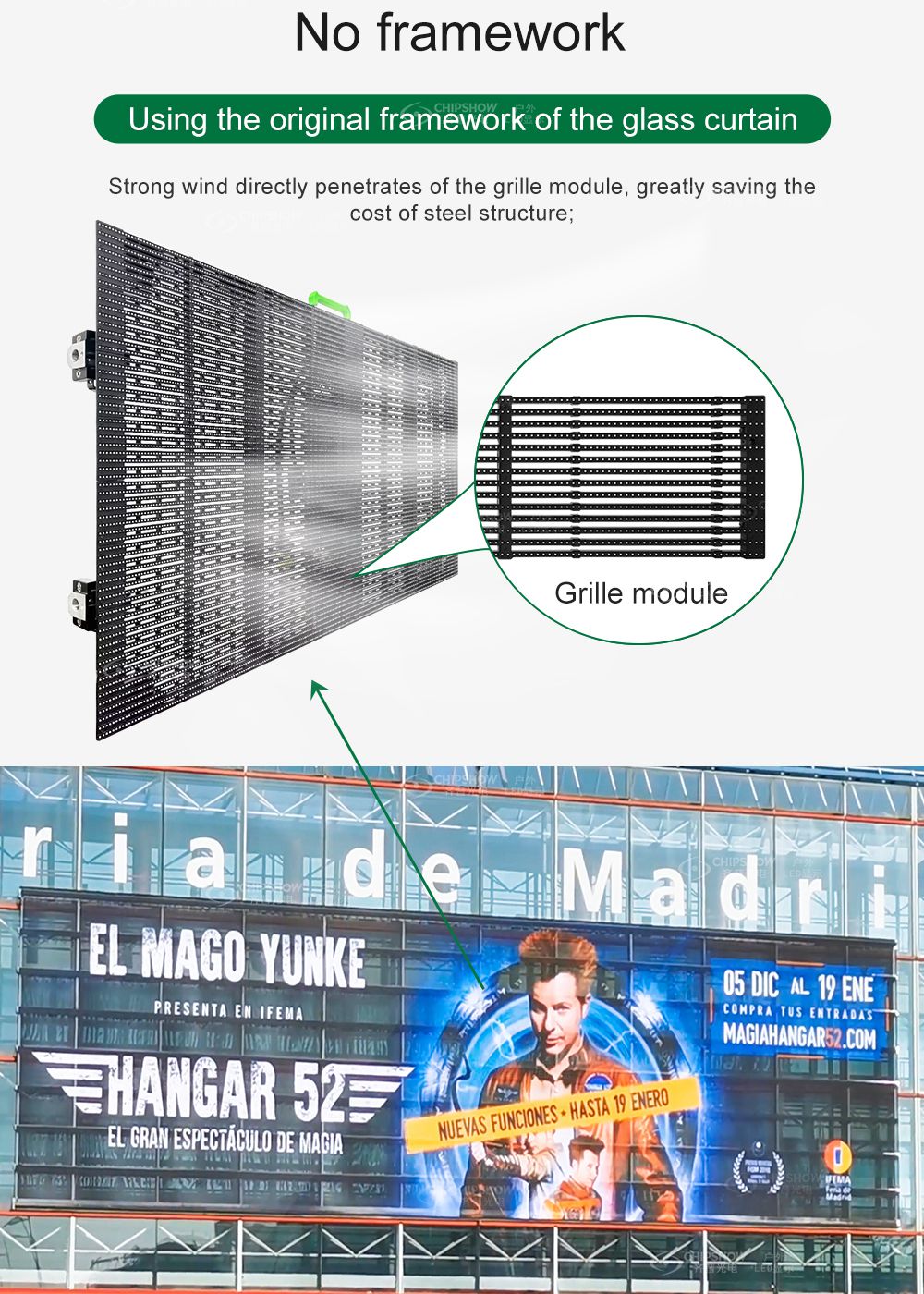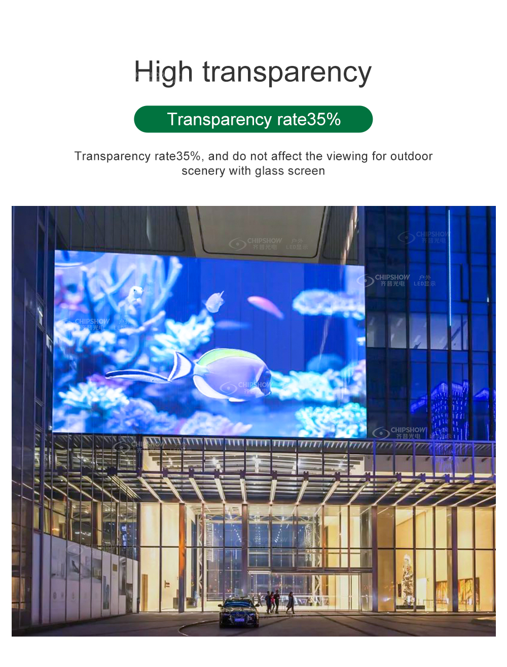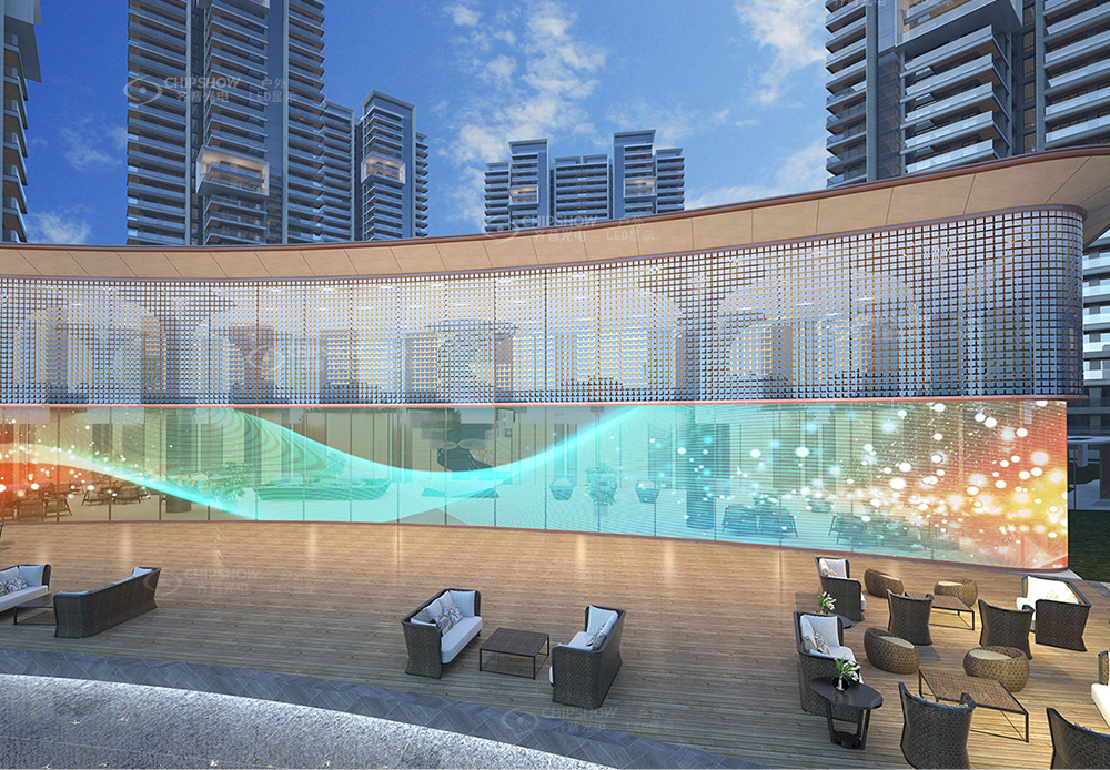2. Trasparenza: 35% la permeabilità, in modo che la tenda di vetro si trasformi in un videowall realistico, no influenzare la vista esterna;
