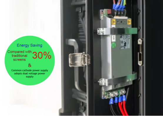 2. Energy consumption and power supply: After increasing the brightness, C-Slim can still add materials without increasing the price, entering the ranks of low-energy outdoor screens, with an average power consumption of less than 180W/㎡. The reason is that this outdoor display uses a common cathode power supply scheme, which is a technical solution based on the improvement of the common anode structure to achieve energy saving for the LED display. Distribute the current and voltage for the R, G, and B chips. The current first passes through the lamp bead and then to the negative electrode of the IC, which reduces the forward voltage drop and the internal resistance of the conduction. Effect. Then, we adopted a dual-voltage power supply method for the power supply, which has the function of automatically deploying dual outputs to ensure the stability of the power supply.