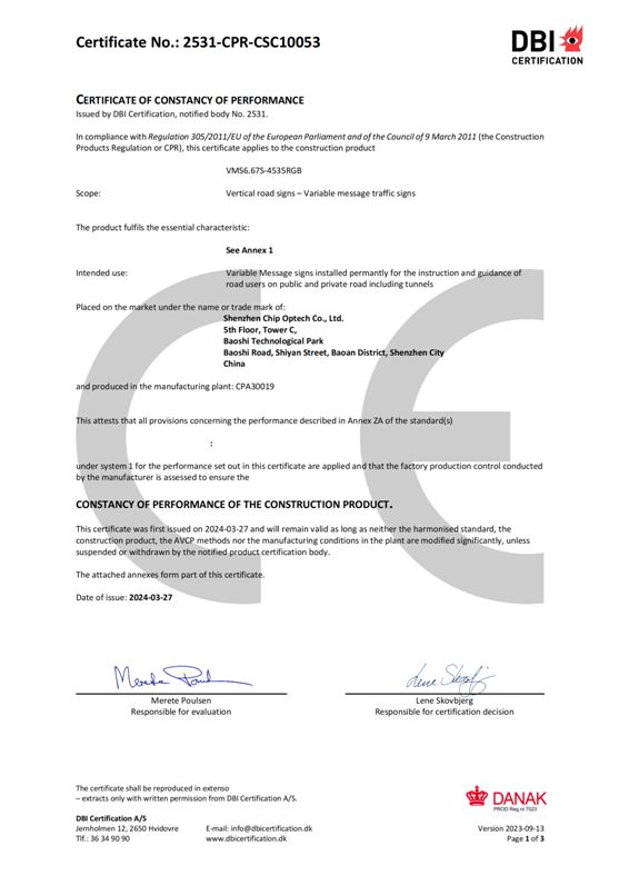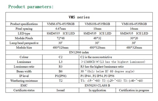 Dopo molti giorni di test e verifiche, il modulo display LED “Chipshow VMS 6.67S - 4535RGB” ha superato ogni dettaglio e ha ottenuto la certificazione della norma europea EN 12966. Questa norma europea specifica le caratteristiche visive e fisiche dei VMS, nonché i loro aspetti di durabilità. Fornisce inoltre i requisiti pertinenti e i corrispondenti metodi di prova, valutazione e verifica della costanza delle prestazioni (AVCP) e marcatura.