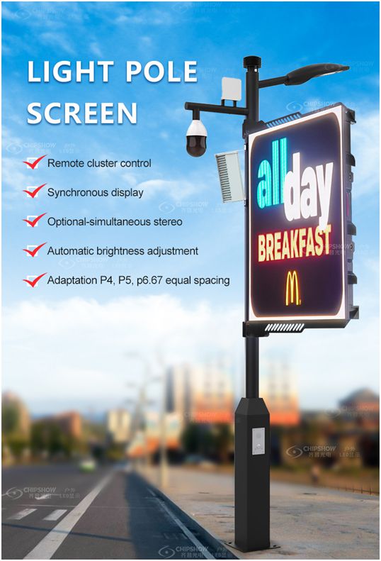 Lo schermo a palo luminoso a LED lanciato da Chipshow ha una spaziatura ridotta, un'alta risoluzione e una qualità dell'immagine chiara e delicata; può essere bloccato direttamente e installato sul palo del lampione tramite staffa, semplice e veloce; controllo intelligente, controllo cluster e trasmissione del gruppo di controllo del gruppo di rete 5G; può sostituire tutte le pubblicità stampate sul palo della luce, e può essere riutilizzato una volta installato a vita; ha un forte impatto visivo e può essere illuminato per riprodurre messaggi pubblicitari 24 ore su 24; ha una grande capacità di informazione, i programmi fatti in casa possono essere riprodotti immediatamente e il contenuto è ricco e mirato a intervalli regolari. Basso costo, verde e a basse emissioni di carbonio.